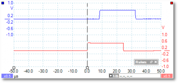 逻辑功能 为了演示逻辑功能,我们将两个脉冲波形馈入通道A和B. 以下是我们的测试信号:来自独立信号发生器的两个25μs脉冲。我们在时间t = 0时在x轴上放置一个标尺,以显示触发事件发生的时间。